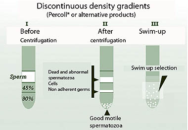 Now for some technical stuff. There are two commonly used sperm preparation techniques – swim-up and discontinuous density gradients.